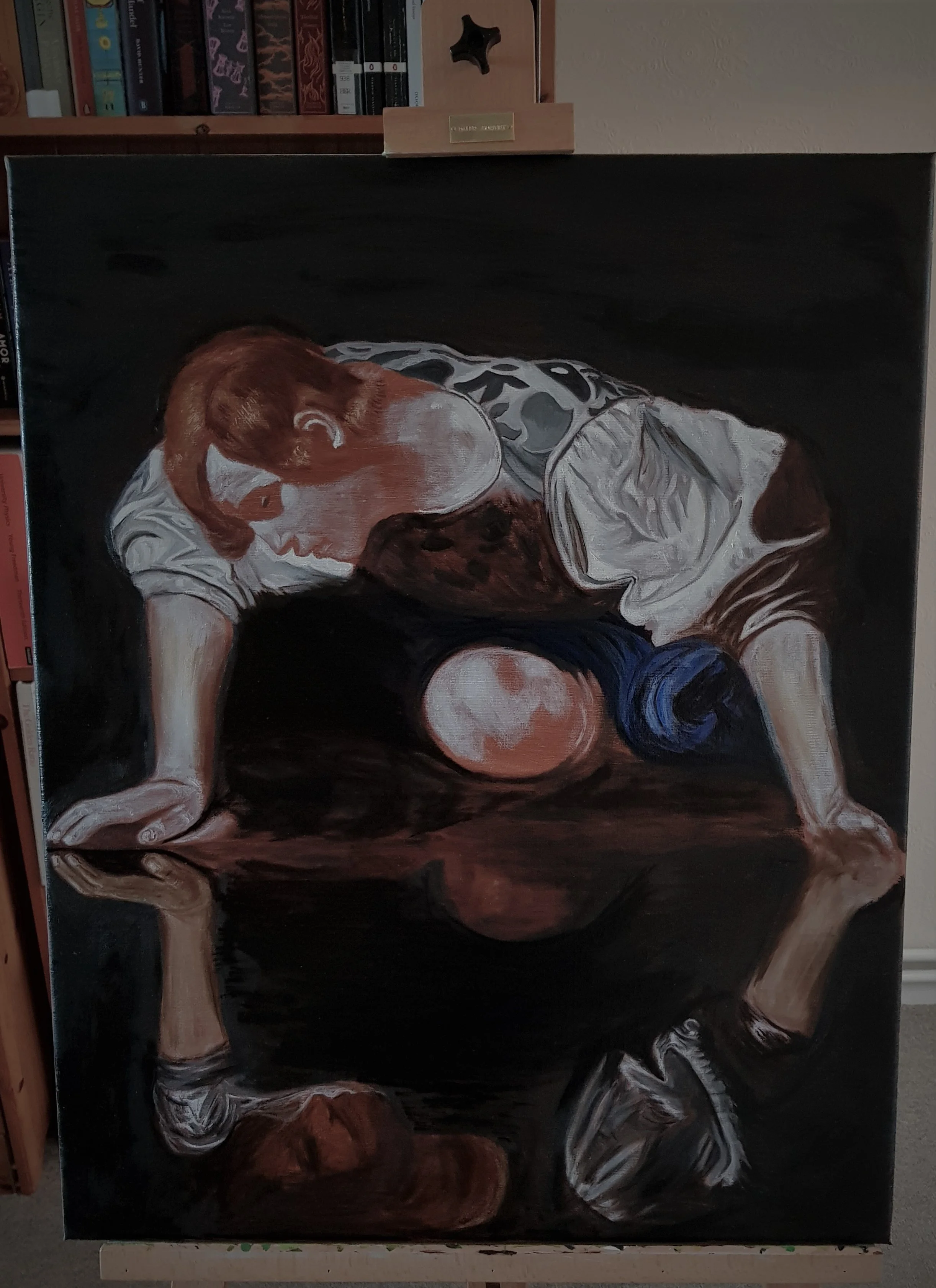 Next, having put in basic shapes for the lighter regions of the painting, I use pure umber pigments to start adjusting the details in the shadow regions of the painting. For example, in the creases of the sleeve, the underside of the tunic, and the face in the reflection. It is worth noting here, how in the finished painting, the face in the reflection looks really nothing like that of Narcissus. It is also painted in an incredibly rough fashion - defined by only a very limited amount of modelling with the dark umber. There are many theories as to who the face in the reflection belongs to - including that of Caravaggio himself. These theories aside, it highlights a really important compositional device. That is, the coarseness of the reflected face relative to the real face registers more truly how the human eye sees, compared to a photographically accurate picture of Narcissus in the reflection.